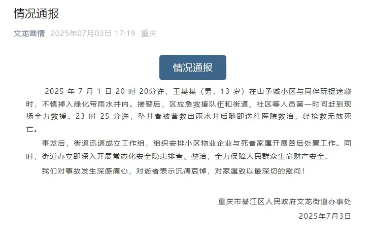 7月1日20时20分许,王某某(男,13岁)在山予城小区与同伴玩捉迷藏时,不慎掉入绿化带雨水井内。接警后,区应急救援队伍和街道、社区等人员第一时间赶到现场全力救援。23时25分许,坠井者被营救出雨水井后随即送往医院救治,经抢救无效死亡。